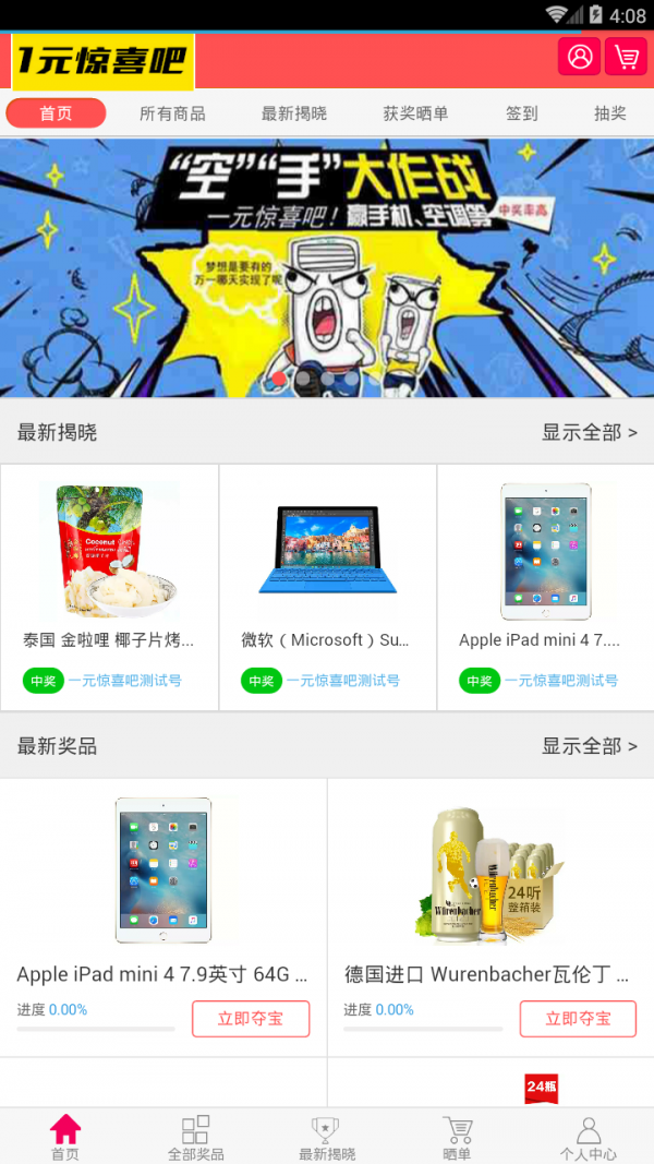 惊喜吧app是一款购物类的软件,惊喜吧app和很多夺宝软件一样,你有机会用一元钱购买到自己需要的产品。