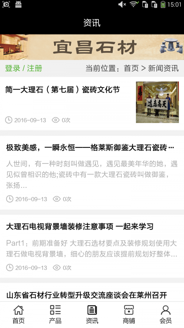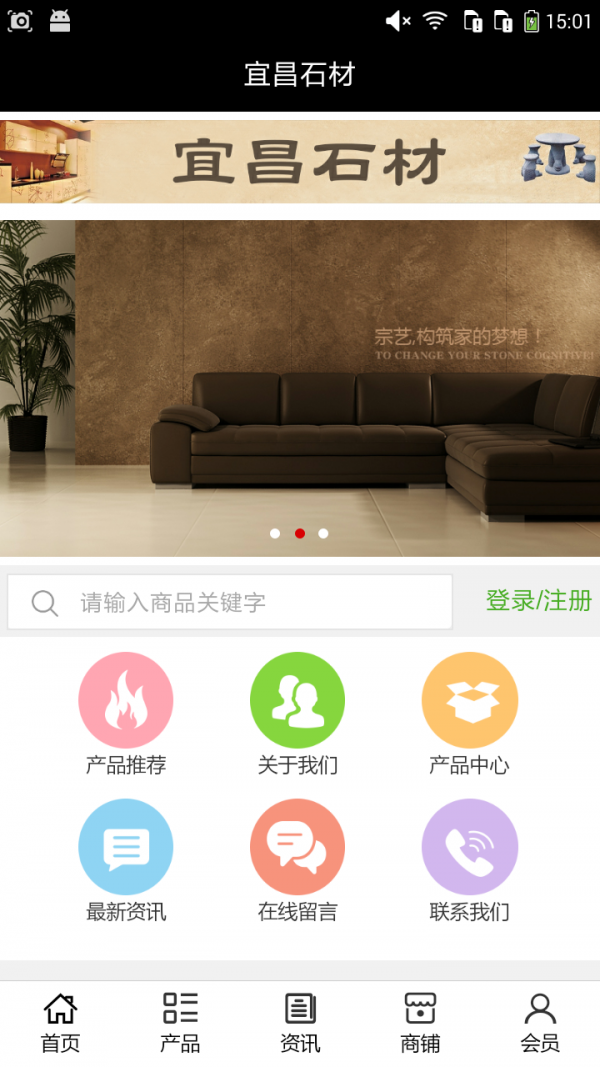 宜昌石材app不仅具备购物、查询订单、搜索商品、行业资讯和产品评价等常用功能,而且还实现了手机版特有的会员注册登录、广告位、招商开店等功能。目标是整合当地品牌商、生产商、经销商,为商家和消费者之间提供一站式解决案。欢迎下载使用!