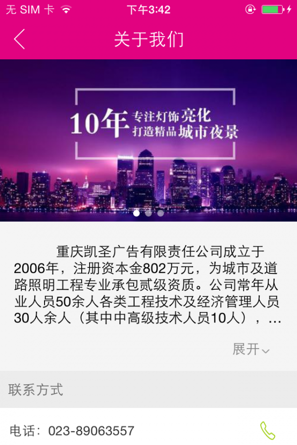 重庆凯圣广告有限责任公司成立于2006年,注册资本金802万元,为城市及道路照明工程专业承包贰级资质。公司常年从业人员50余人各类工程技术及经济管理人员30人余人(其中中高级技术人员10人),项目经理5人,并于2012年取得建筑施工企业《安全生产许可证》,2013年取得首届重庆中小企业知名品牌企业证书,2015年取得中国中小企业信用等级AAA级证书。