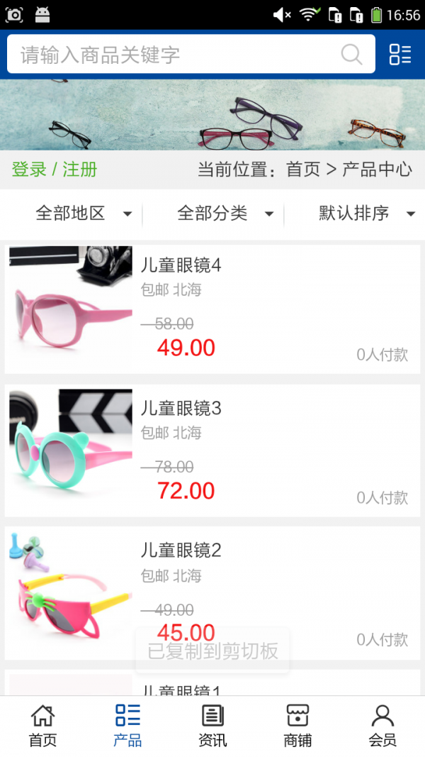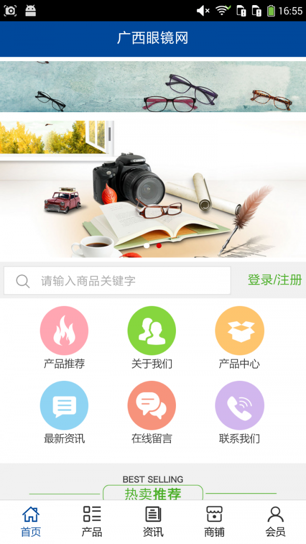 广西眼镜网客户端不仅具备购物、查询订单、搜索商品、行业资讯和产品评价等常用功能,而且还实现了手机版特有的会员注册登录、广告位、招商开店等功能。