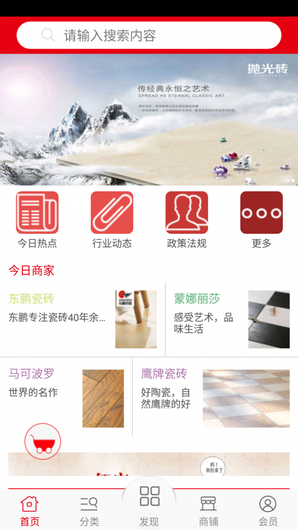粤东瓷砖网是一个专业的购物网络平台,随时为你提供最新资讯,产品展示,招商袋里等信息,该客户端现面向全国招商,各大企业可以在该客户端上发布供求信息,发布广告,发布行情,让各大企业及广大客户更为便捷,该客户端向广大客户展示了一个大型的移动互联网门户平台,以便捷的浏览方式,强大的应用功能,最新的应用资讯信息,为广大客户提供了一个丰富的信息平台。