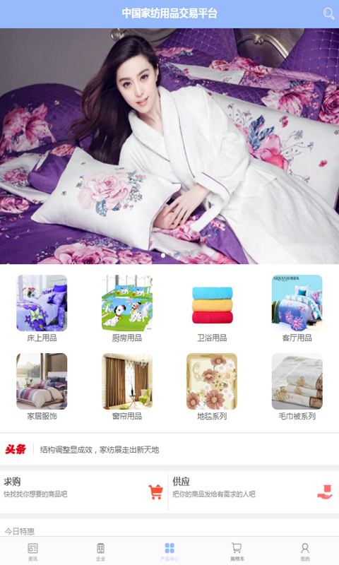 中国家纺用品交易平台app帮助企业公司和商业人士了解行情,促销产品,把握商机,开拓市场,从而为生产厂家、商家与市场流通之间建立经济、快捷、准确、丰富的专业信息服务及电子商务服务,是中国家纺用品交易平台行业相关人士上网找生意的好帮手!