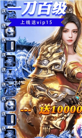 1、上线送vip15,元宝*10w,金币*10000万