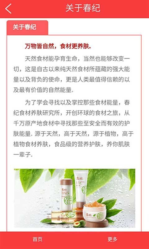 春纪护肤品是一款介绍护肤品的移动客户端,关注春纪护肤品的朋友注册会员之后,可以享受春纪护肤品的一切服务,企业商家可以参考春纪护肤品平台,该APP内介绍了众多关于春纪护肤品的信息,并且春纪护肤品app大大的提高企业知名度,相信春纪护肤品APP会越来越完善!