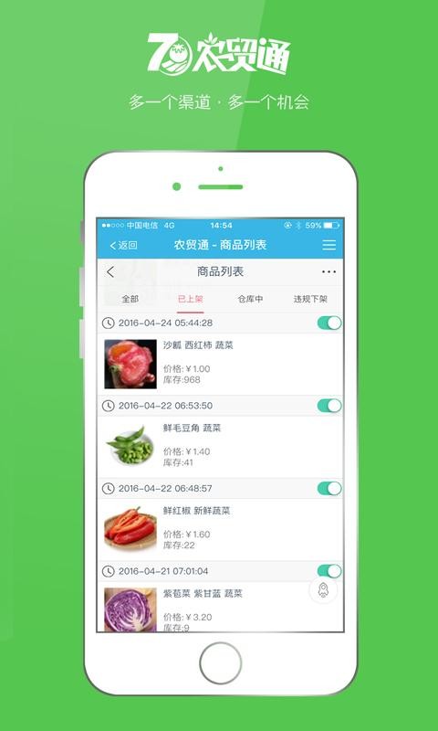 农贸通,优质农产品上行平台。为农业标准化作业、大宗单品流通、安全食品供应链提供深度解决方案。 农贸通商户管理端,让产品发布、订单处理更便捷。