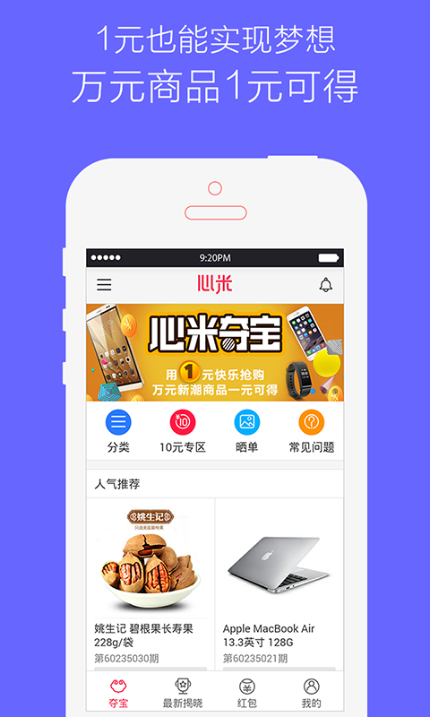 花1元就有机会抢购手机、笔记本、单反等热门产品,心米夺宝,一切皆有可能!万元新潮好货1元就购,现金红包天天疯抢,更可免费夺宝。