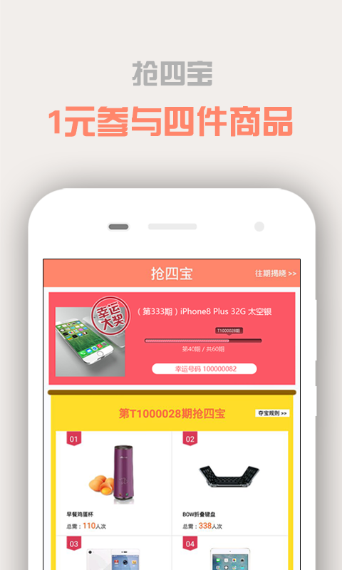 抢四宝模式,颠覆一元夺宝,投入一元马上获取四次中奖机会,一元满足你的所有幻想。