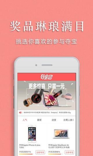 夺宝会app是一个全民一元零钱购物平台,夺宝会app有琳琅满目的精品、有公平公正的规则、还有出人意料的惊喜,给自己1个机会吧,相信1元的力量,幸运之神在这里等你哟。