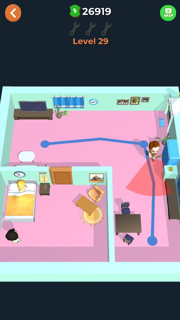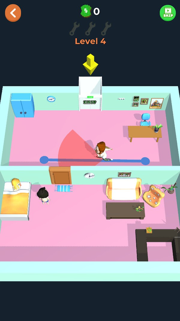 玩家在游戏中将会变成老王,你需要在被人发现之前快速的逃离,从房间到门口的距离会非常的远,你必须要找到最短的路线才可以成功的逃离出去,随着不断的挑战,关卡中的难度也是会逐渐的提升的,找到更多的技巧非常的重要,还有丰富的道具也是有机会得到的,在关键的时候更好的帮助到你。