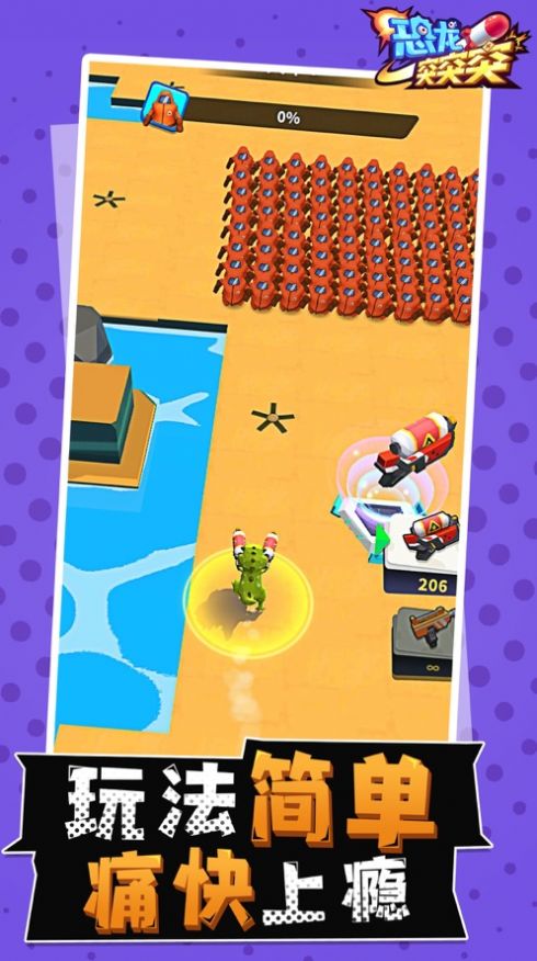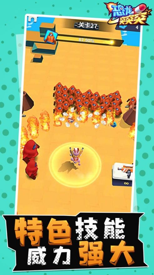 只要出现在你面前的敌人统统扫射歼灭就行,所以说这款游戏的玩法主体就是使用武器击杀你面前的敌人,而且玩家们在游戏中所操控的角色是一只非常Q萌可爱的小恐龙,并且还是以动漫风格打造的恐龙,你可以在游戏中操作恐龙来使用各种武器和敌人进行对战,只不过每一款武器都是需要进行解锁才能够获得到的。