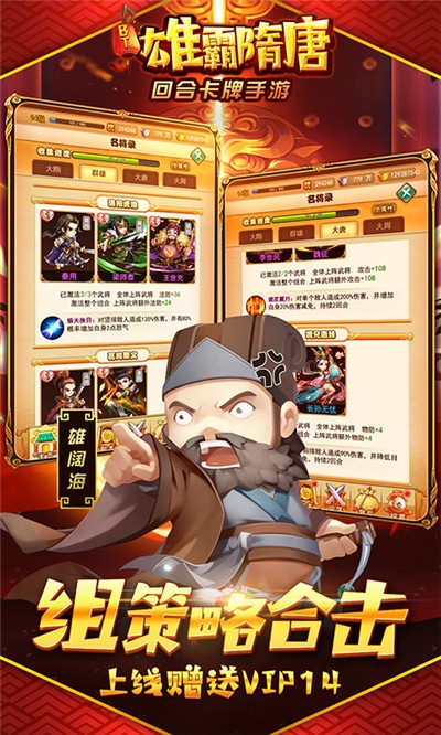 雄霸隋唐是一款独一无二的隋唐题材游戏,满足所有爱好隋唐历史的玩家的需求,游戏采用了竖版卡牌方式,解放双手,轻松畅玩,0操作,重策略,在这里,你不单单要组建一套默契的阵容,你还要考虑每个武将修炼什么武器,修炼什么必杀技,佩戴什么类型将心。而且这些武将不仅仅只是一张卡牌,而是活生生武将,可以在名将录里面跟他们打交道,据说交情深了,还可以获得他们传授绝技,另外派遣不同武将去闲逛,还能够触发各种奇遇剧情,了解该武将的生平,堪称卡牌游戏和角色扮演的完美结合。同时游戏还有野外BOSS存在,装备全靠打,组队拼命抢,超好玩的一款游戏。