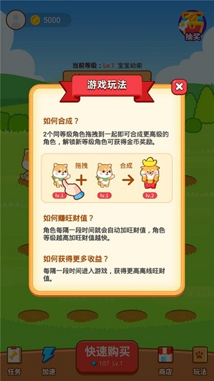 相同种类的两只狗狗可以合成,高等级的狗狗提供的收益当然更高;