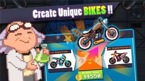 1.游戏画面采用像素风格,给你超怀旧的游戏体验,像素类型的摩托车看上去更加个性鲜明特点十足,