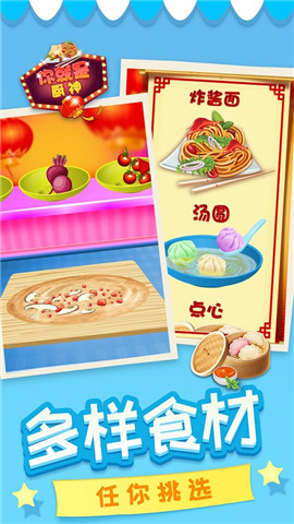 你就是厨神是一款超好玩的美食游戏,你就是厨神游戏里有多样食材任你挑选,玩家可以自由发挥制作各种菜式,轻松休闲,可以放松心情,丰富的游戏内容,有喜欢的朋友快来下载体验吧。