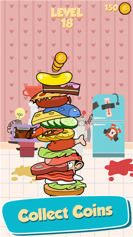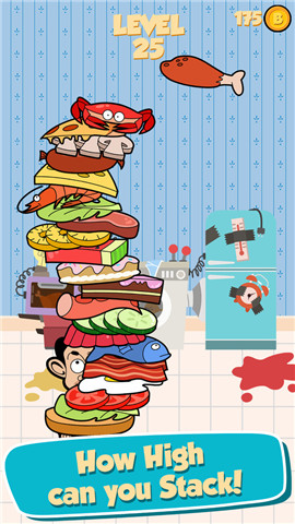游戏中玩家需要控制憨豆先生左右移动来接住掉落的食材,从而使食物塔越积越高