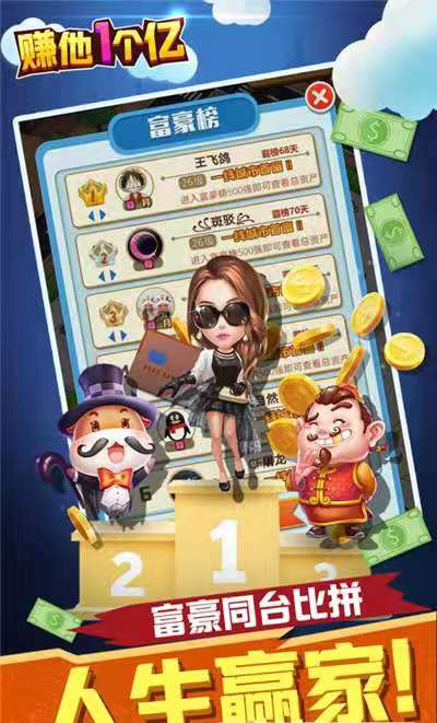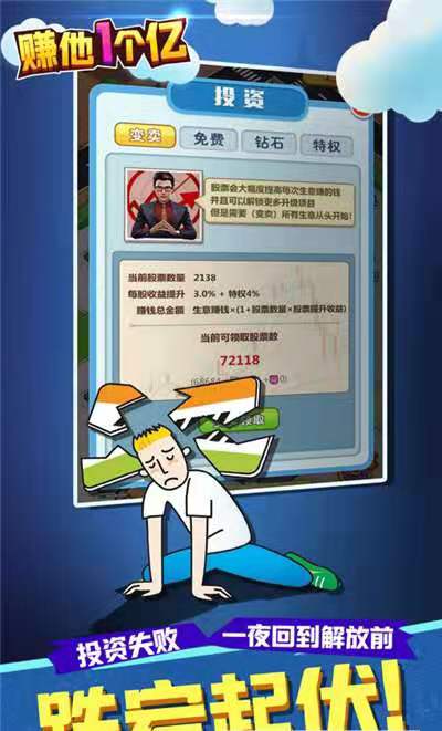 赚他一个亿最新版是一款非常好玩的模拟经营类型游戏,游戏中还有一些非常搞笑的剧情,想要从一个小小的屌丝成长到世界首富,还是有挑战的,游戏中你可以自由的发现各种各样的商机,选择最合适的时机进行投资,你要在有限的时间之内赚到足够的金币,才能开拓自己丰富精彩的一生,赚他一个亿贺岁版中可以多次重置人生,你可以再来一次,快来下载体验吧。