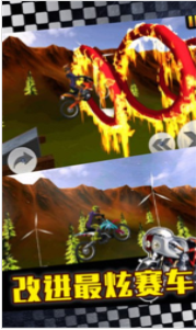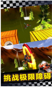 开着摩托车飞驰在魅力十足的赛道上,做一些超炫绝技,如翘轮子,疯狂跳跃,腾空翻滚等等。