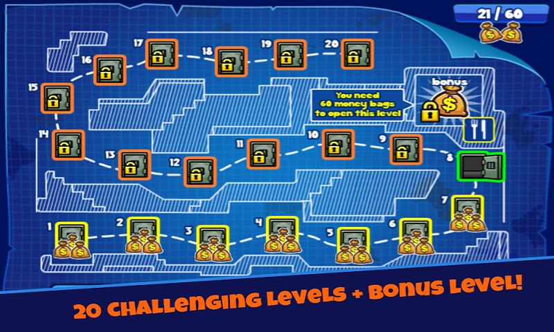 惊天大劫案游戏是以闯关为主题的游戏,精致精美趣味、脑力界面制作非常受人喜欢,内容选用动漫卡通趣味风格,在游戏中你将会面对全新的关卡挑战,游戏中加入了更致命的机关谜题,利用不同的道具来达到无法到达的地方,收集更多的金币,用金币购买更多有用的道具。