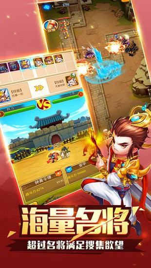 Q版的人物造型,萌态十足,更有红唇皓齿、一笑倾国的美人,为英雄增加属性,助竞技场耀武扬威!200多名传奇历史武将让你尽收帐下。