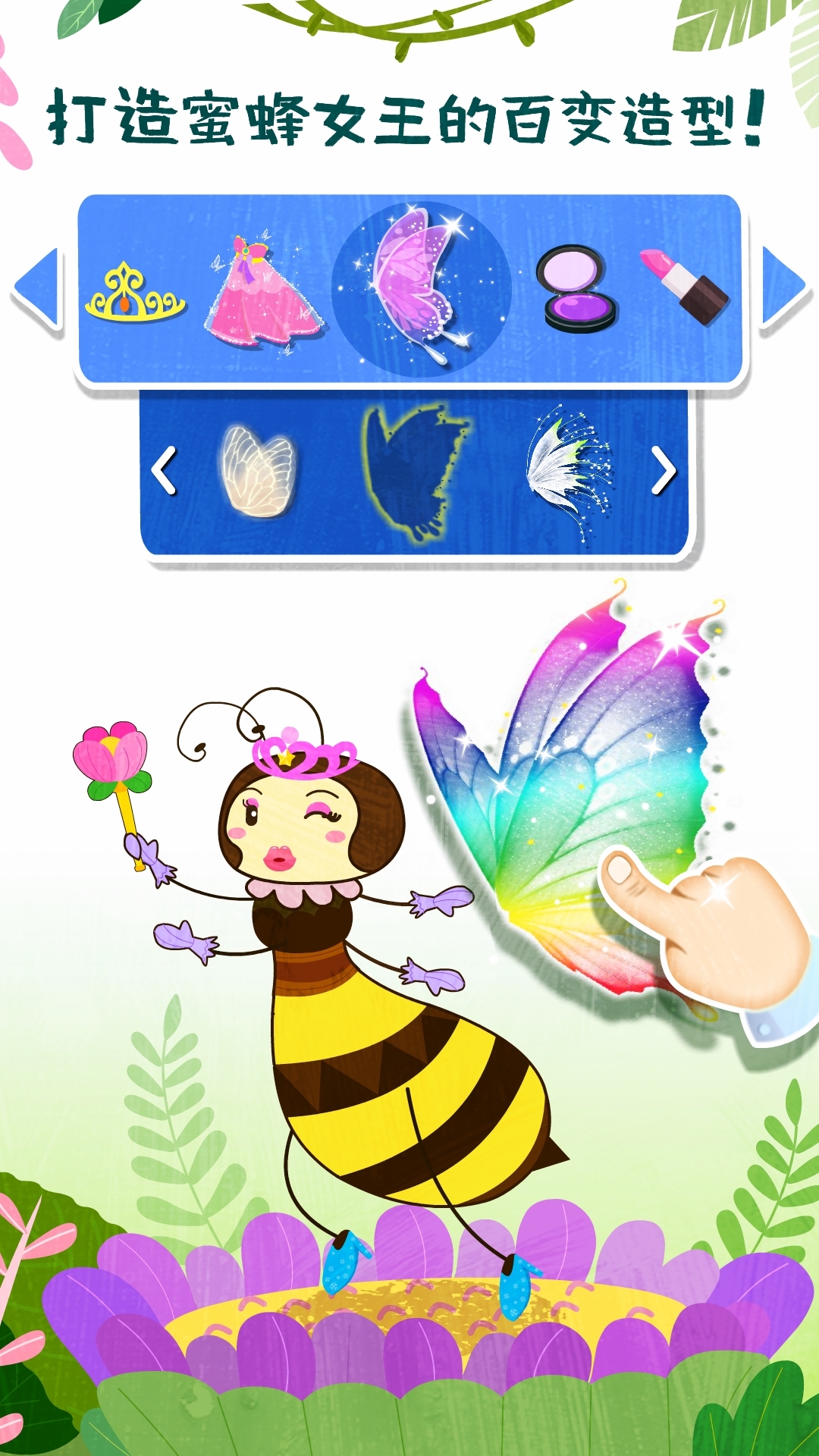 舞会快开始了!动手装扮蜜蜂女王吧,涂口红、抹眼影、挑裙子……50多款饰品任你搭配,百变造型,总有一款是你的菜!