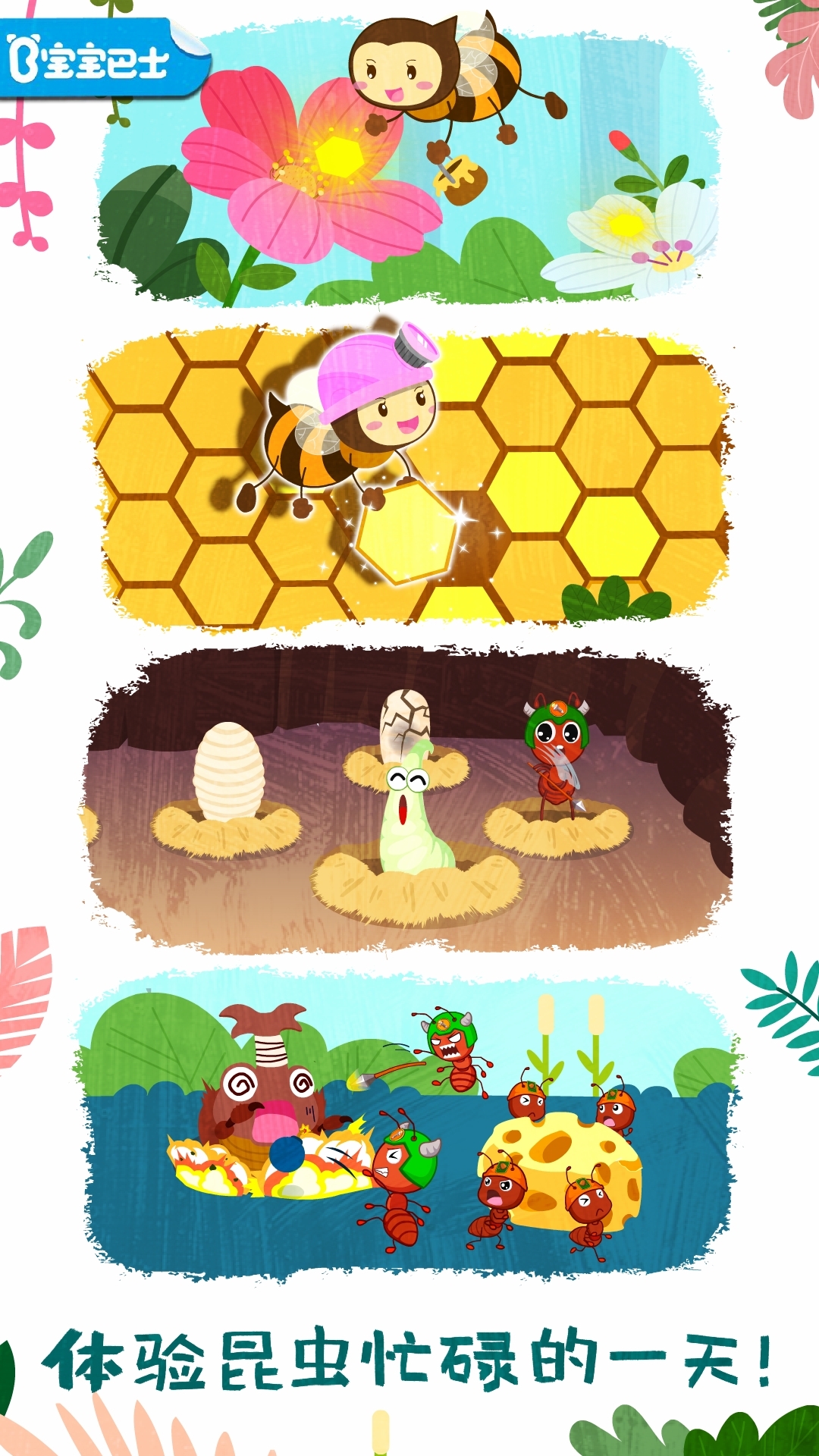 有趣的情景模拟,让宝宝在游戏互动中,全方位认识蜜蜂和蚂蚁,学习昆虫百科知识!