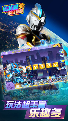 奥特曼疯狂跑酷作为一款热血卡通风格酷跑手游,游戏中,你将变身迪迦,赛罗,捷德,欧布组成最强大的宇宙英雄联盟。