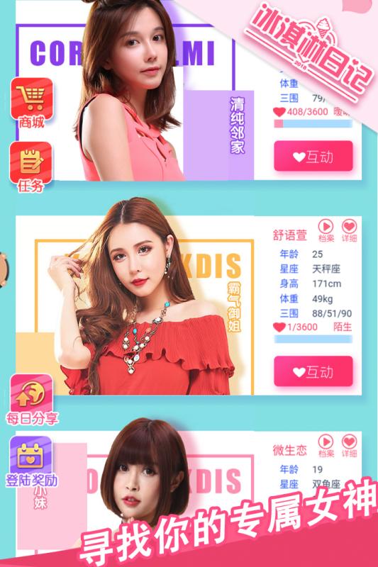 冰淇淋日记手游作为一款男性向视角的恋爱养成游戏,这款它使用真人出境,非常的新颖,你将可以在游戏中和三位小姐姐互动,当然你也要完成各种游戏任务来解锁更多游戏场景,好玩不累,欢迎各位感兴趣的朋友们下载试玩这款游戏。