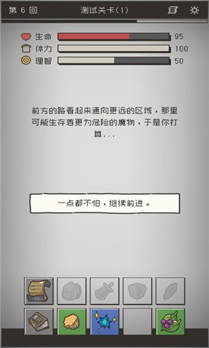 1,页面上方会有人物基本血量、体力和理智,血量为0就over了。中间会出现随机四张卡牌