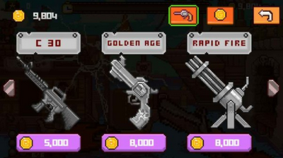 2,金币可以交换枪支,不同的枪支会有一定的时间扩展功能,还很酷,像素风格的形象,收集你的武器,适合所有年龄的游戏。