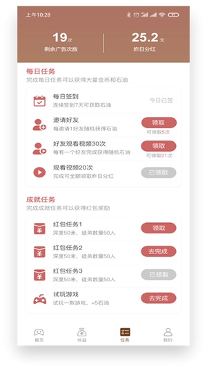 2、全新的推广挖矿软件,石油大亨分红app任务种类非常丰富,天象石油大亨app用户只需要做做任务就能获取丰厚的红包分红;