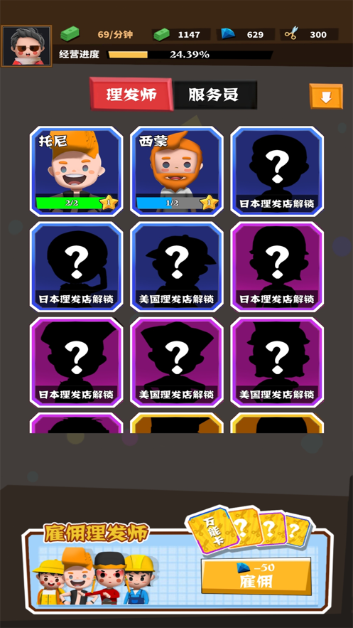 游戏中的理发师和服务员以卡牌的形式获得和成长,衷心耿耿的他们将会坚守在他们的岗位,帮助玩家完成各个店铺的经营与升级。