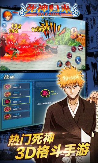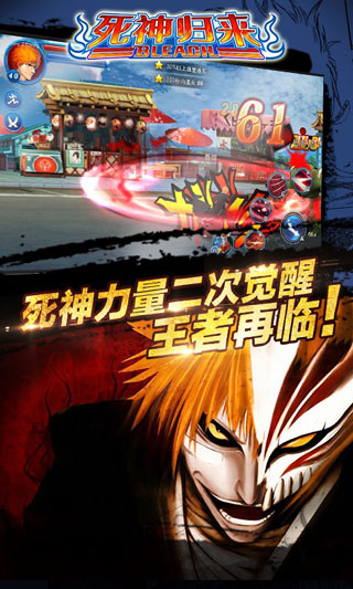 死神归来作为一款横版动作过关卡牌手机游戏,以日本超人气热血漫画死神Bleach改编,完全忠实原著的唯美画风、简单快捷的战斗系统、漫画复刻的原著人形、强大的卍解系统、庞大的援护架构,让动漫迷们很快代入到原著中的世界,以源于原著的四大职业:死神、灭却、完现术者、高中生,穿梭于现世、流魂街、瀞灵庭、虚圈,和各种熟悉却富有挑战性的敌人作战。