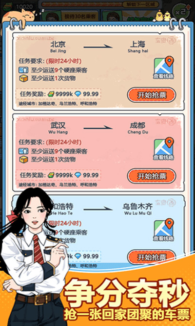 经营火车中国作为一个超级好玩的模拟经营游戏,在游戏中,能让玩家真实感受到经营火车中国的辛苦,你不仅要给火车排班,还要让客户享受更好的旅程。有时候的过节抢票也是完美还原了中国的抢票现象。感兴趣的玩家赶紧来下载体验吧!