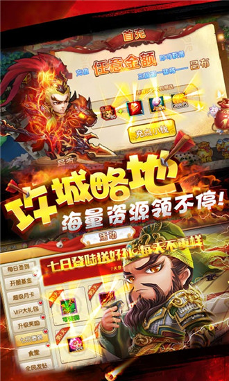 2、人中吕布,马中赤兔,首充就送吕布,直升60级经验,新手礼包。