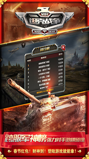 全民坦克战争是一款策略坦克射击对战类手游。游戏超高精细度真实还原百款二战坦克,享受驱使钢铁洪流大杀四方的快感,力求打造一流的游戏体验带你进入真正的坦克世界!重回二战战场体验经典战役,参与者将在战乱世界中经历重重磨砺,利用生产和科研等体系打造属于自己的装甲力量,采用军事或外交手段与其他玩家交流,最终成为号令一方的坦克战神。在游戏中,单体坦克配以武器、炮弹、装甲、发动机,钢铁的力量让敌人胆战心惊。坦克潜力、技能各不相同,没有最强,只有更强,阵容的搭配大有讲究,您可根据不同关卡需求来挑选不同种类的坦克应战,高攻、高防、高闪避,随机应变,任君搭配,组成超强坦克阵容,一路冲锋所向披靡!更有抗日远征、经典战役等丰富玩法和丰富福利。游戏首周平均每位玩家获赠钻石超过30000,第一天登陆即送小飞象、霞飞、M36杰克逊等多种福利活动。主打坦克重兵器作战的玩法,在全民坦克战争中玩家可以体验经典战役还有真实的战斗指挥玩法,自由指挥军队作战。全民坦克战争游戏分为四个游戏场景,每个游戏场景分为15个关卡,游戏操作简单,更有坦克性能以及武器系统供你组装升级。强大的火炮系统、激光炮系统让你体验现代战场的火爆。而且,各种坦克、自行火炮、坦克歼击车等应有尽有,顶级坦克军团等你发号施令,用坦克征服世界!还等什么,感兴趣的玩家赶快一起下载体验试玩吧!
