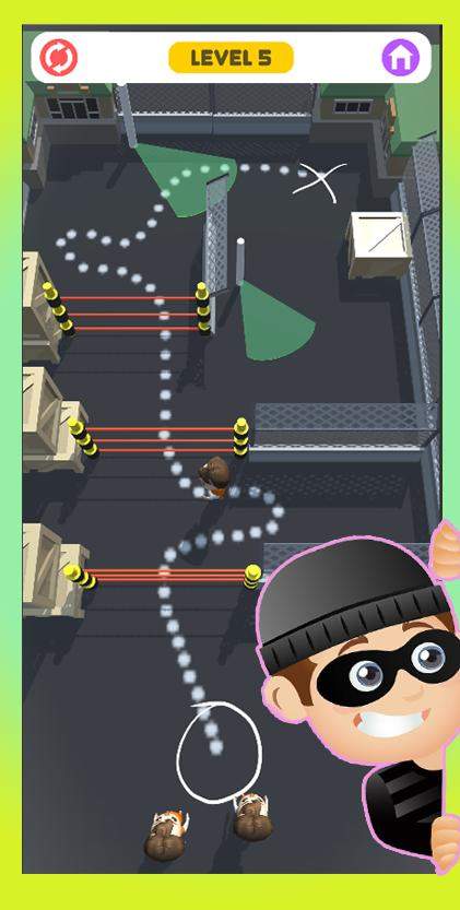 抢劫逃生刹车游戏是一款非常有趣的休闲益智类游戏,这款游戏的玩法非常的具有创意,游戏的操作也是十分的简单,玩家可以通过在屏幕上面画线来控制小偷行走的路线,你需要帮助小偷躲避所有的警报器还有监控设备,并且最后成功的偷盗后安全的逃离现场。
