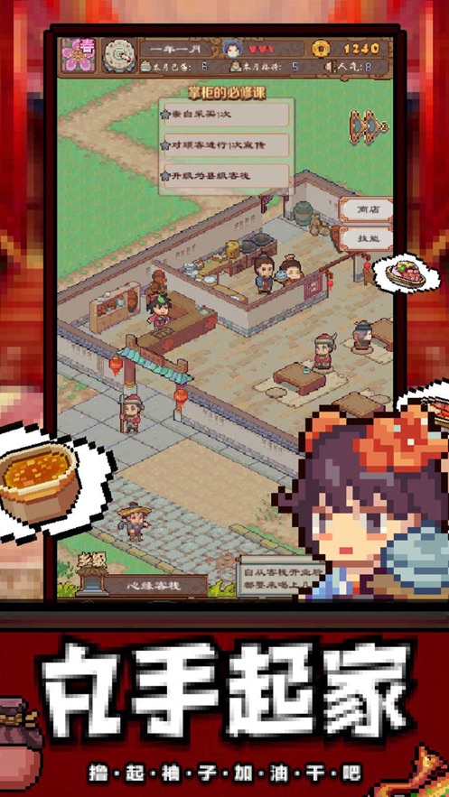 这是一款像素风的模拟经营客栈游戏,故事发生在三国时期,而你,将会是这家客栈说一不二掌柜大人;
