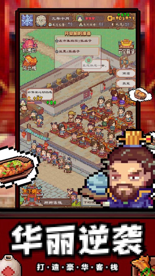 3、从乡间名不见经传的小客栈到金碧辉煌的天下第一客栈,提高人气,吸引客流,快让顾客挤爆你的客栈吧!