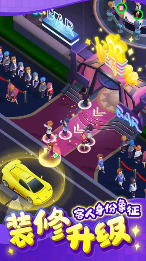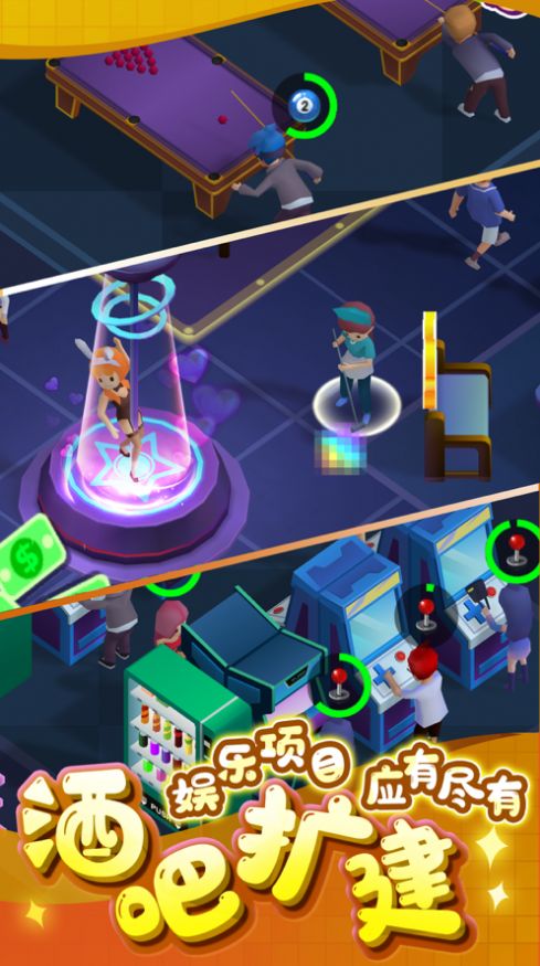 玩家在游戏里面扮演一个俱乐部老板的角色,不断给俱乐部增加各种各样的设施以获得更多利润,调酒品酒,舞池蹦迪,飞镖桌球保龄球应有尽有,全方位为顾客缓解一天的疲劳,创新的游戏心得,各种类型的音乐非常带感,还有活跃的气氛组。