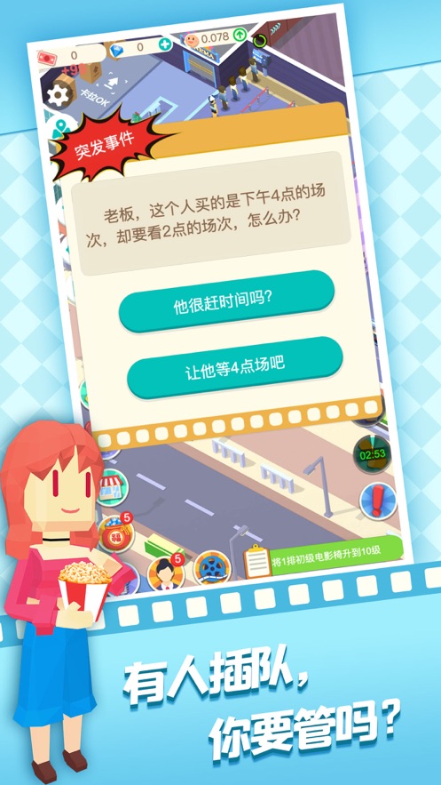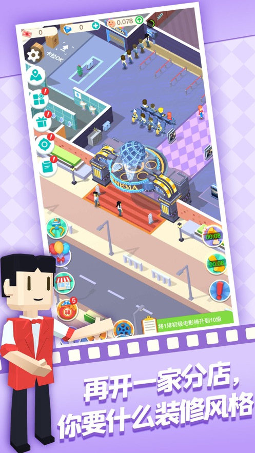 1、在游戏里面,在游戏里玩家从经营电影院开始,一步步赚钱,然后买下电影公司,拍出自己喜欢的电影;