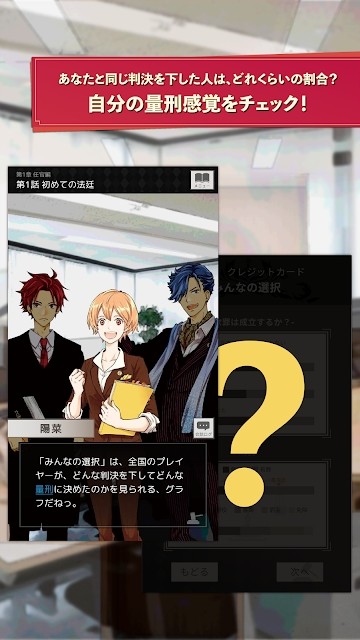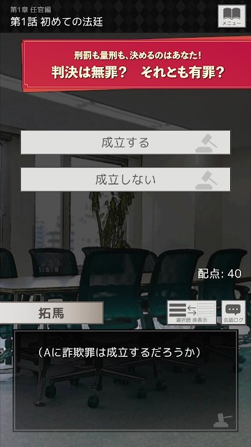 2、根据剧情对话去判断整个案件走向,有罪或无罪都在你的一念之间,累积经验熟读法律,努力朝向经验老到的裁判官前进!
