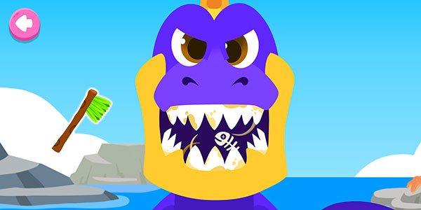 5、在刷牙游戏里,玩家通过拖动牙刷,把恐龙口腔内的污渍彻底清理干净就能过关。