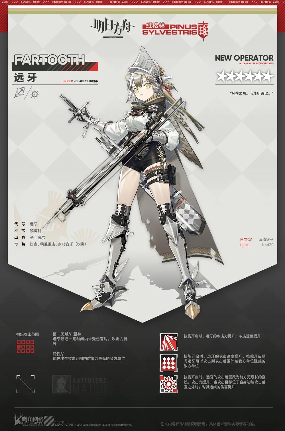 首先最为关键的便是新增干员的寻访信息,由于2.5周年感谢庆典将近,很多博士都会对这次的卡池有所顾虑。在没有具体数值的情况下,很难对远牙做出一个合理的评价。但从目前已知的信息来看,作为与守林人、安比尔相同分支的神射手狙击,其伤害能力必然不需担心,而其超越攻击范围的打击能力也十分值得期待,只要在倍率上没有下毒,远牙将会成为一个十分亮眼的干员。除了资源极其有限的博士,大可以在这次卡池中搏一次彩光之后再做取舍。