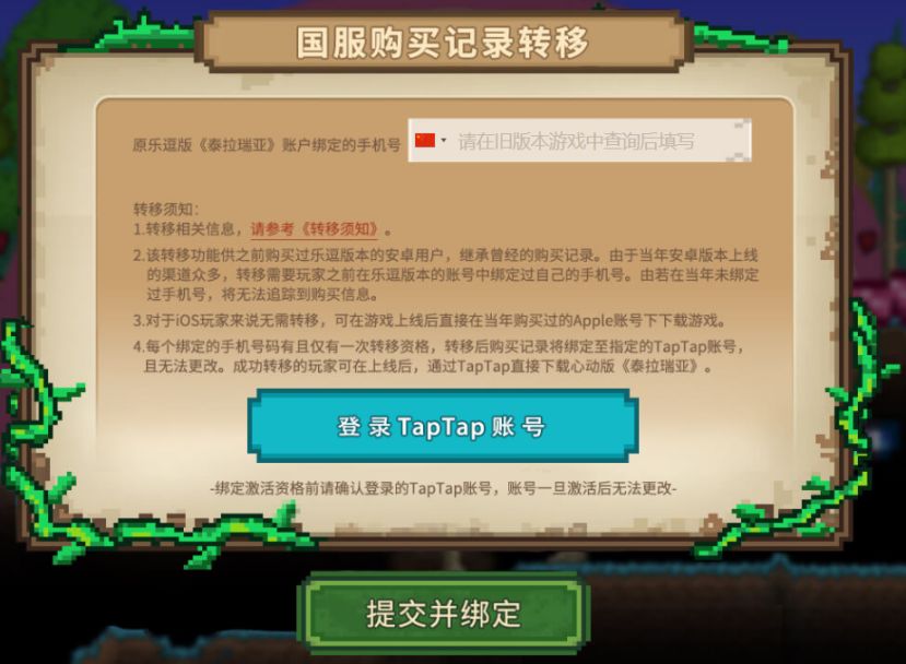 1. 转移需要当年购买过《泰拉瑞亚》的乐逗账号【绑定过手机号】,并通过转移页面,体验查找当年的购买记录,并将其绑定在登录的TapTap账号。