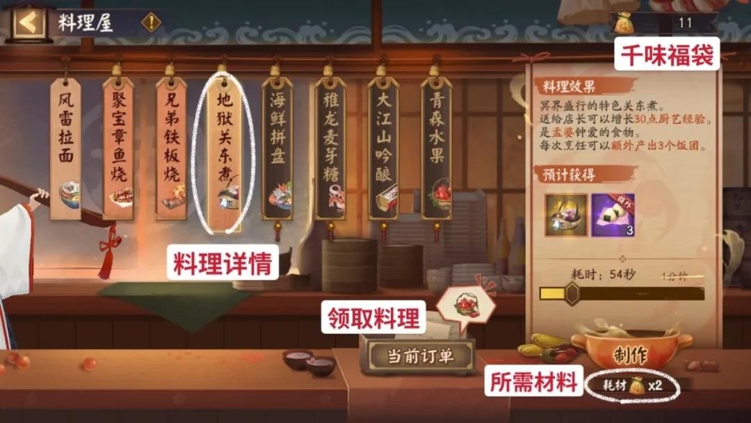 制作并投喂店长喜爱的料理(比如把地狱关东煮投喂给孟婆),可以开店并给店长升级。
