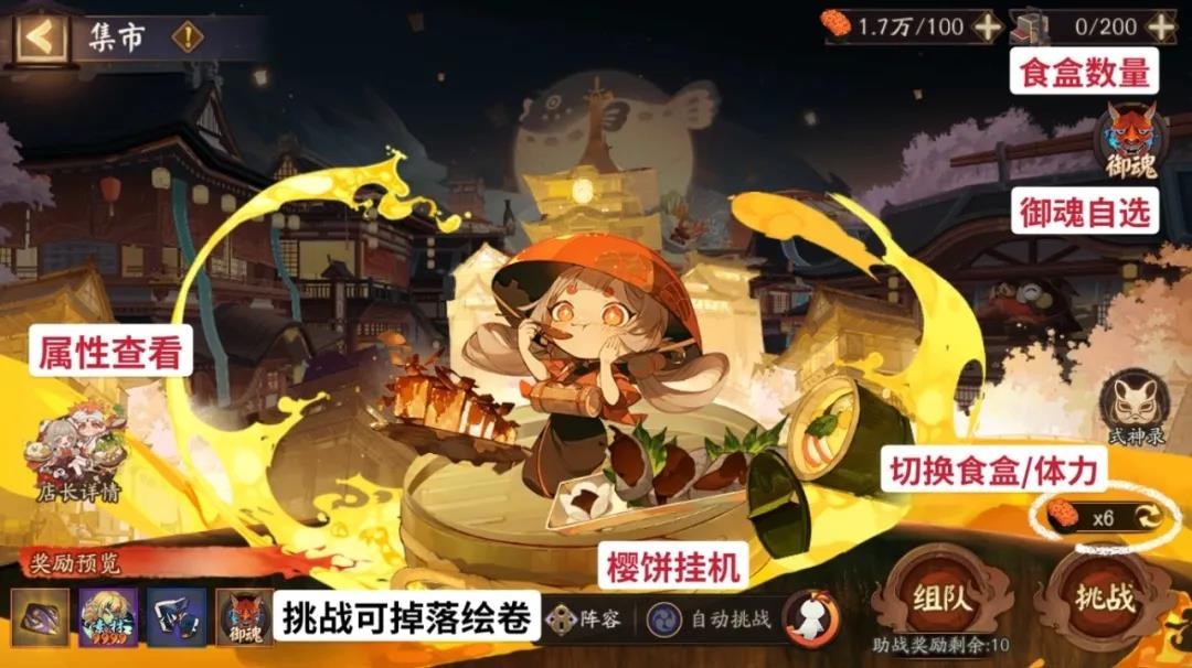 参与集市挑战每次消耗1个,可获得自选御魂掉落加成。每天0点恢复50个,商店可勾玉购买储存上限200个(之后不再自动恢复)。