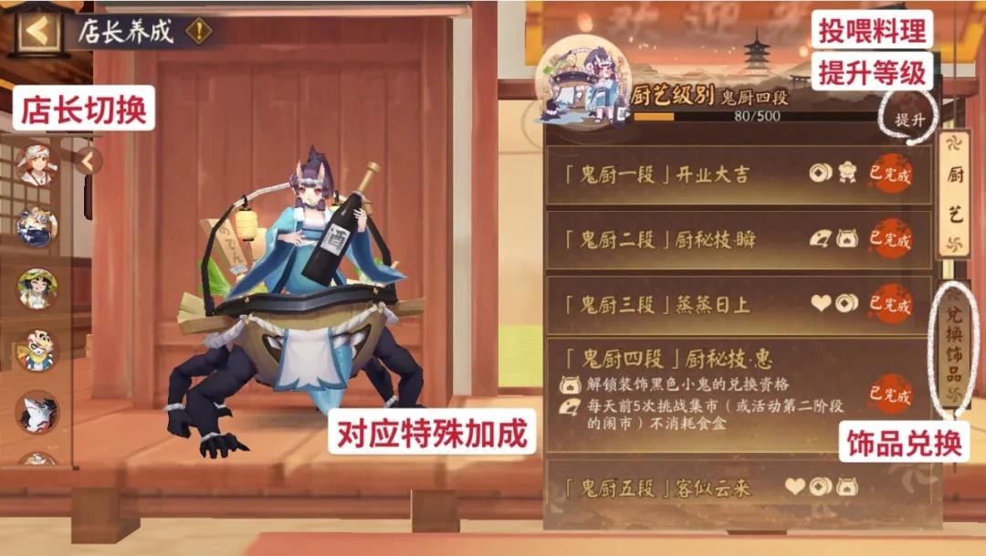 「店长养成」(画面底部一排):提升厨艺获取特殊赠增益效果,要记得投其所好哦~