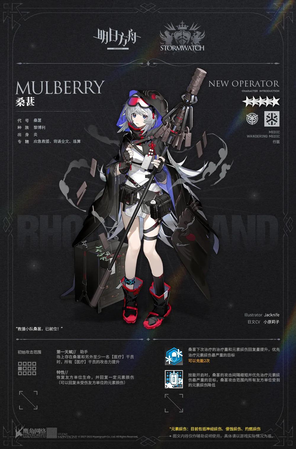 来自炎国灾害救援组织“春乾”的桑葚小姐,是该组织与罗德岛之间交流学习项目的第一批参与人员。