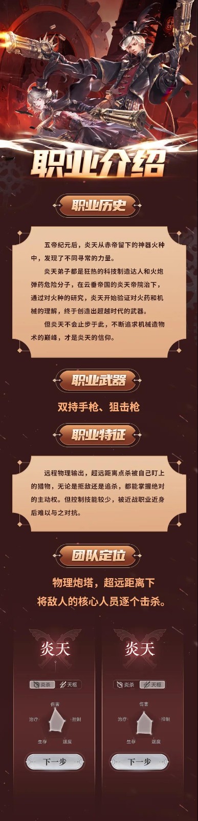 之前放出的炎天职业套装,受到了大家的一致好评。与此同时各位冒险家的期待也更加强烈了,小谕甚至觉得再不告诉大家具体时间,真的会有被套麻袋的风险。今天本谕就不卖关子了,8月19日,新职业炎天正式上线!期待与你一同体会炮火与硝烟的浪漫。