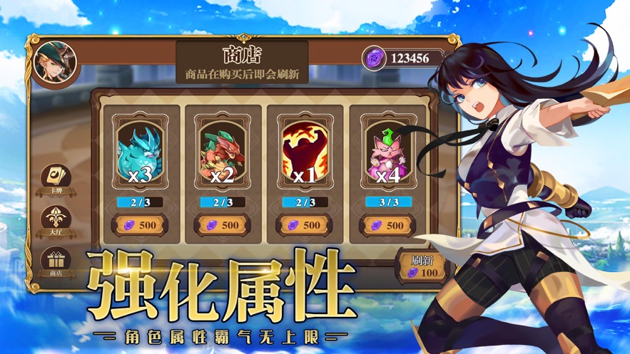 1、强化属性加深,不同的卡牌有着不同的能力,帮助你组建强大阵容。